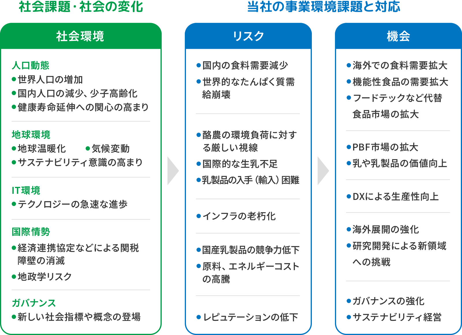 実現に向け、雪印メグミルクグループのサステナビリティ経営が目指す「栄養を届け、環境に配慮し、人材を活かす」取組みを推進するために、2023年に、重要課題(マテリアリティ)を見直し、「持続可能な食の提供」と「食による健康への貢献」を追加しました。