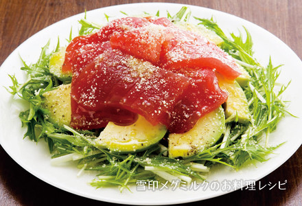 水菜を3~4cm長さに切って器にひろげ、1)のアボカドとまぐろを並べる。