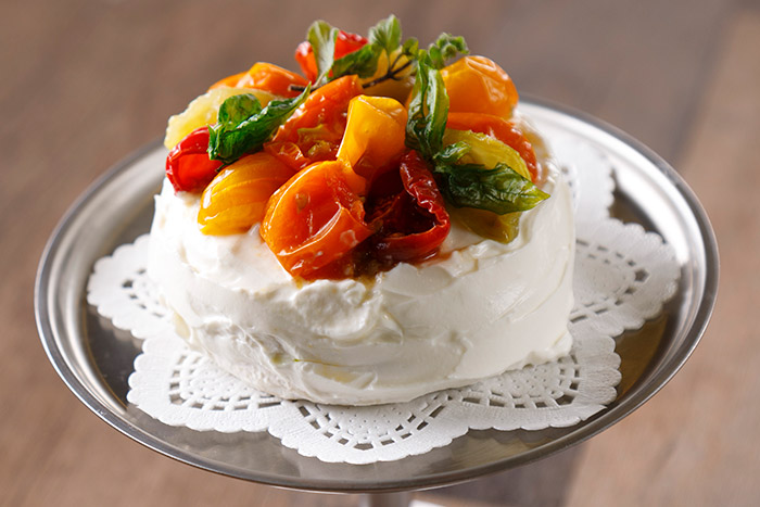 「雪印北海道100 カマンベールチーズ」にオリーブをサンド、たっぷりのマスカルポーネとセミドライトマトをのせてケーキ仕立てに。
