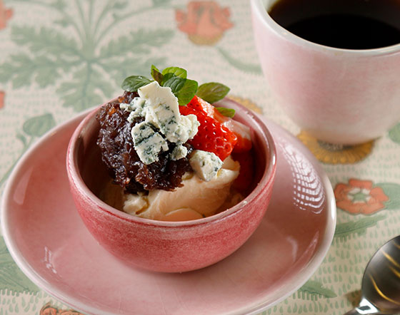 ブルーチーズは凍らせて豪快に砕いて。いちごと彩りにミントを添えて。