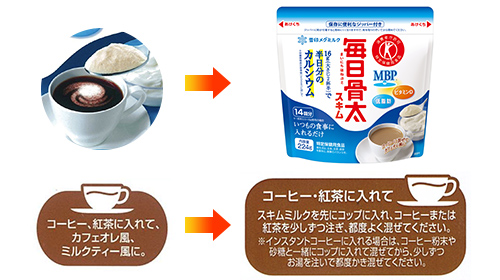 写真のようにコーヒーの上からスキムミルクを入れて混ぜるとダマになりやすいとのお声から写真をカフェオレに変更し、コーヒー、紅茶への使い方を載せました。