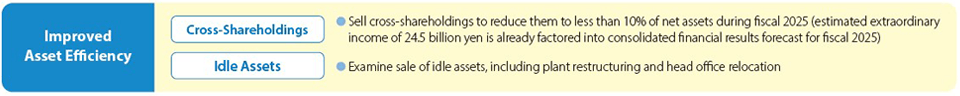 We will continue working to reduce cross-shareholdings, which we have been pursuing since Group Medium-Term Management Plan 2025. In addition to reducing cross-shareholdings to less than 10% of net assets by the end of fiscal 2025, we will implement an asset-light strategy that will reduce the Group’s fixed assets such as manufacturing sites and logistics facilities. We will dramatically improve productivity and profitability while also increasing asset efficiency by reducing the Group’s assets, restructuring plants, including collaboration with other companies, and selling idle assets and allocating the cash to functional ingredients and the overseas business, which are growth areas. We will also endeavor to increase funding efficiency by reducing the balance of cash and deposits, given the rising burden of interest as the Bank of Japan starts to lift interest rates.