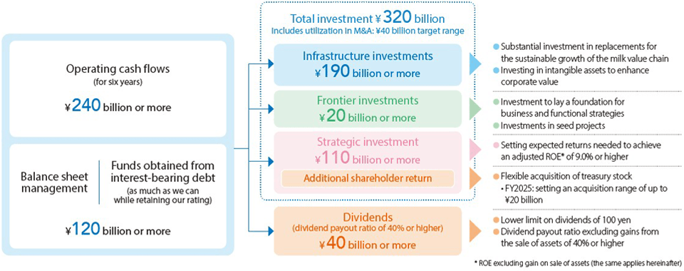 Over the six years through fiscal 2030, we will use our operating cash flows of approximately 240.0 billion yen, along with approximately 120.0 billion yen in interest-bearing debt and cash inflows from asset sales, as funding sources for implementing growth investment. We will categorize investments according to their position in the business portfolio into infrastructure investments, frontier investments, or strategic investments, and we will decide on individual projects based on the significance, necessity, and expected return on the investment. In particular, for strategic investments, we have set expected returns needed to achieve an adjusted ROE* of 9.0% or higher and will implement investment of 110.0 billion yen or more. We plan to invest 320.0 billion yen in total, and, included in this amount, we are also considering pursuing M&As with a target range of approximately 40.0 billion yen, to accelerate growth. Specifically, we intend to consider M&As with a particular focus on strengthening overseas expansion, growing priority functional products, and expanding alternative food products