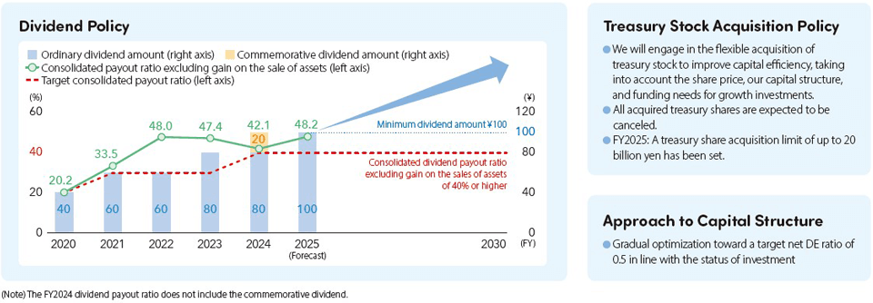 We will allocate operating cash flows, utilization of interestbearing debt, and cash inflows from asset sales to growth investment first, and return cash that exceeds the level of growth investment to shareholders. As our dividend policy, we have set a minimum dividend amount of 100 yen in addition to a consolidated dividend payout ratio excluding gain on the sale of assets of 40% or higher, and we will pay dividends consistently. We have decided to engage in the flexible acquisition of treasury stock with the aim of increasing capital efficiency, while taking into account the share price, our capital structure, and funding needs for growth investment. We plan to cancel all acquired treasury shares. For fiscal 2025, we set a 20 billion yen treasury share acquisition limit. Moreover, we will gradually optimize our capital structure toward a target net DE ratio of 0.5, in line with the status of investment under our policy of pursuing “aggressive investment” utilizing interest-bearing debt.