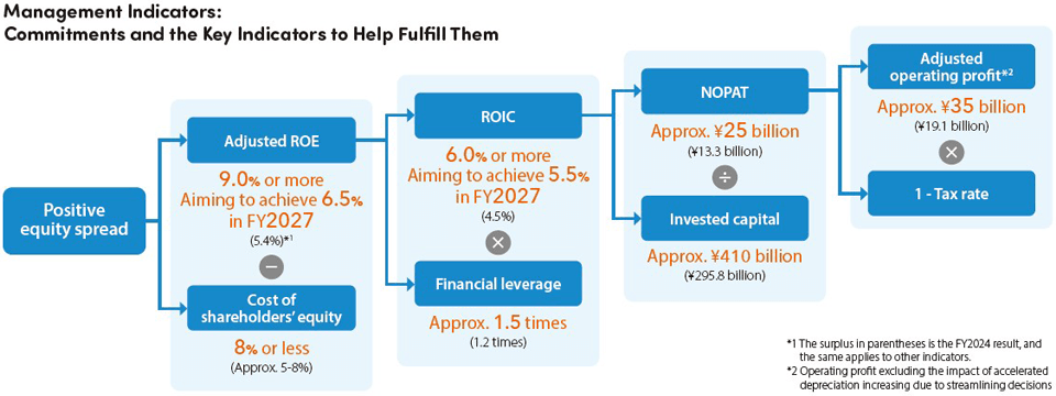 We will translate our commitment to addressing the social issue of food sustainability into an increase in the Group’s brand value, strengthen trust in our products and the company itself, and deliver sales growth and higher added value. Furthermore, we will pursue cost reductions and increases in production efficiency by building a sustainable supply chain and developing environmentally friendly production technology. Under the concept of “drastically transforming Megmilk Snow Brand’s assets,” we will move forward on two fronts: improving profitability and growth potential through business portfolio transformation and improving asset efficiency and capital efficiency through balance sheet management and capital measures. By realizing a positive equity spread through the achievement of adjusted ROE of 9.0% or higher and ROIC of 6.0% or higher, we aim to establish a strong presence as a company that is committed to enhancing corporate value.