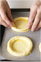 丸く抜いたパイシートの表面にフォークで穴をあける。縁に溶き卵を塗って帯状の生地をのせる(写真a)。 |
