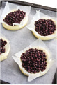 天板にクッキングペーパーを敷き、(2)を並べる。小さく切ったクッキングペーパーをそれぞれにのせ、上に重しのあずきをたっぷりのせて(写真b)、200度のオーブンで10分焼く。あずきをはずしてさらに5分焼く。 |