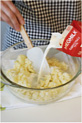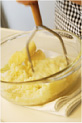 温かいうちに牛乳、生クリームを加え(写真d)、コンソメ、塩、こしょうで調味し、クリーミイなマッシュポテトを作る。 |