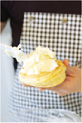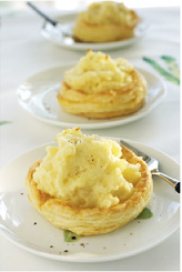 (4)のパイケースに(7)をたっぷりとのせ(写真e)、オーブントースターなどで軽く温め、こしょうをふっていただく。 |