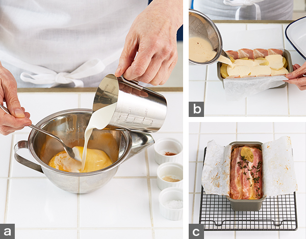 - 5. (4)に(3)を少量流し入れる。(2)のじゃがいもを1/3量ほど並べて軽く押さえ、さらに(3)を流し入れる。これを繰り返して全量を詰める(写真b)。