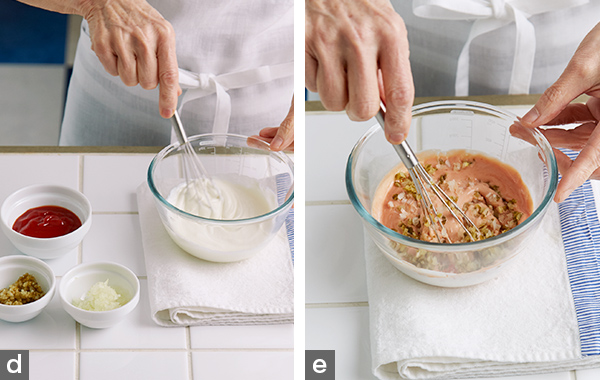 - 2. ヨーグルトトマトソースを作る。ヨーグルトはキッチンペーパーを敷いたざるに入れ、冷蔵庫に10~15分おいて軽く水切りをする。ボウルに水切りしたヨーグルトを入れて軽くほぐし(写真d)、ケチャップ、玉ねぎとピクルスのみじん切りを入れて混ぜ、塩、こしょうで味を調える(写真e)。