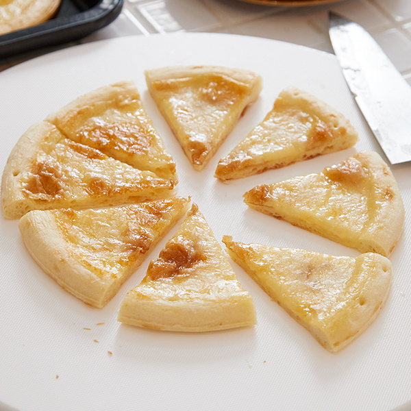 おいしく仕上げるコツは、チーズを広げる前にピザ生地をオーブンでから焼きしておくこと。こうすることで、生地の表面が香ばしくなり、チーズの味もより引き立ちます。もっちりとして縁はカリッと焼けたピザ生地と、とろとろのチーズソースが絡み合って、思わず笑顔になるおいしさです。