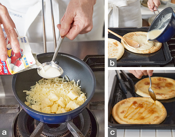 - 3. ①の生地に熱い②をかけ(写真b)、再び250℃のオーブンで5~8分、こんがりと焼き色がつくまで焼く。