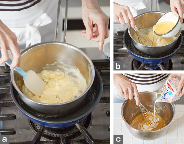 - 1. ボウルに刻んだチョコレートと薄切りにしたバターを入れて湯せんし、ゴムべらで混ぜながら溶かす(写真a)