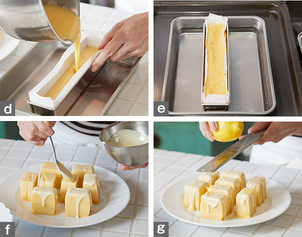 - 5. コーティング用のチョコレートを湯せんで溶かし、粗熱を取る。④のテリーヌを型からはずし、食べやすく切り分ける。溶かしたチョコレートをかけ(写真f)、レモンの皮をすりおろし(写真g)、器に盛る。