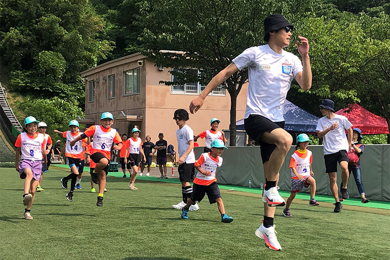 選手が日々のトレーニングで実施しているウォーミングアップを一緒に行ったり、参加したジュニアジャンパーひとりひとりにジャンプ技術向上のアドバイスを行うなど、ジャンプ人口の拡大、育成にも取り組んでいます。