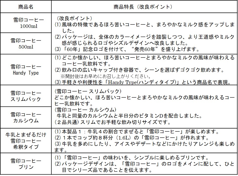 ・『雪印コーヒー』(1000ml、500ml)は、まろやかなミルク感をアップし、ミルクとコーヒーの風味がそれぞれ引き立つようにコーヒーを調整することで、雪印コーヒーの特徴であるほろ苦いコーヒー風味とまろやかなミルクの風味がより味わえる仕立てにしました。パッケージも、おなじみの「雪印コーヒー」らしく、よりミルク感が感じられるデザインにしました。
