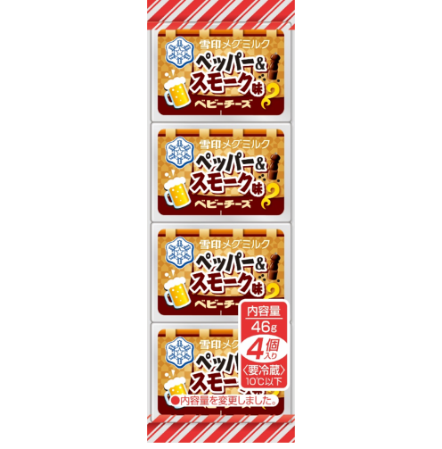『ペッパー&スモーク味 ベビーチーズ』は、ペッパーとスモークの風味で2つの味わいを一度に楽しめる、お酒のおつまみにぴったりのチーズです。特にビールとの相性は抜群です。