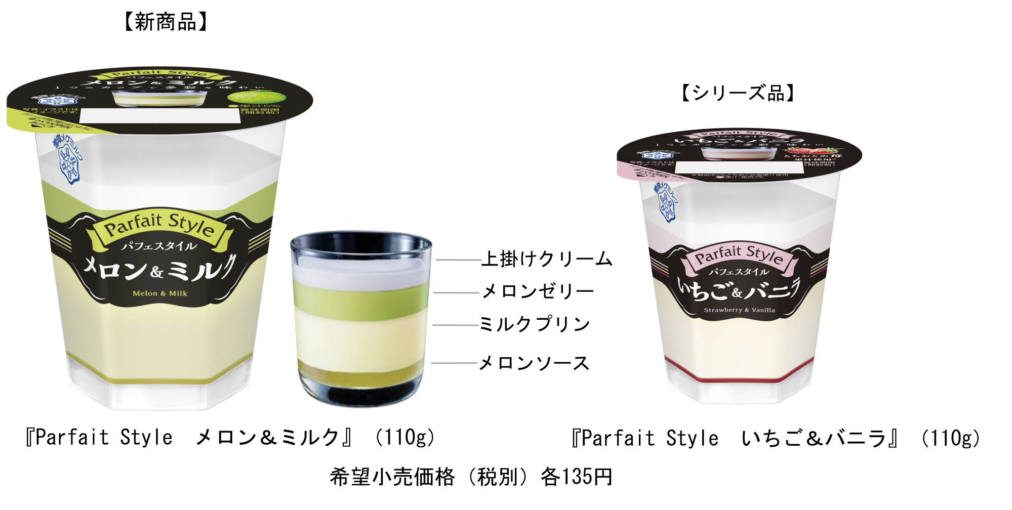 パフェを提供するフルーツパーラーでは、メロンパフェは季節を問わず楽しまれている人気の定番メニューです。そこで、このたびご好評いただいている「いちご&バニラ」と、今回新たに発売する『メロン&ミルク』の2品で、パフェの味わいを再現したスイーツとしてご提案してまいります。「メロン&ミルク」もシリーズ品と同じく4層仕立てで、ジューシーで香り高いメロンパフェの味わいを再現しています。