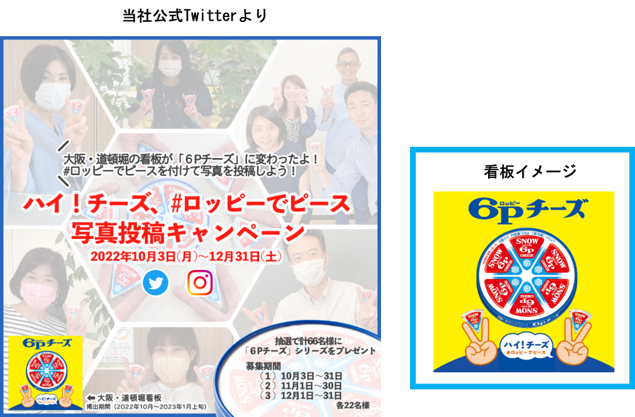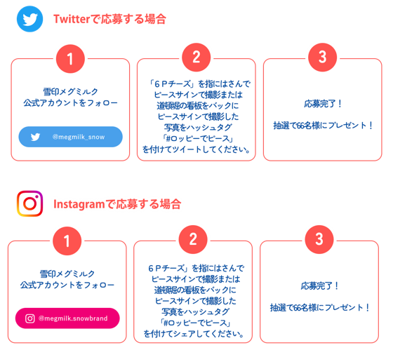 応募は、当社の公式TwitterまたはInstagramをフォローし、看板と一緒にピースサインで撮影した写真、または『6Pチーズ』を指にはさんで撮影した写真に「#ロッピーでピース」を付けてご投稿いただきます。ご投稿いただいた方の中から、『6Pチーズ』にちなんで抽選で合計66名様に、『6Pチーズ』シリーズの詰合せセットをプレゼントします。