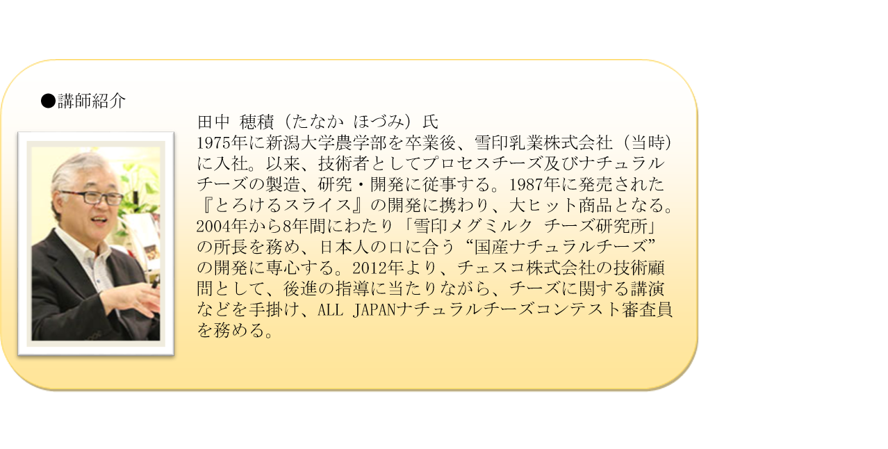 昨年のオンラインチーズセミナーと同様、田中 穂積 氏を講師にお迎えし、今年60周年を迎えた「雪印北海道100 カマンベールチーズ」の歴史や製造方法等についてお話をしていただきます。さらに、切れてるタイプの開発担当者の開発秘話や、商品担当者による「雪印北海道100 カマンベールチーズ」のうまみの秘密、うまみを活かす新たな楽しみ方などを伝授します。