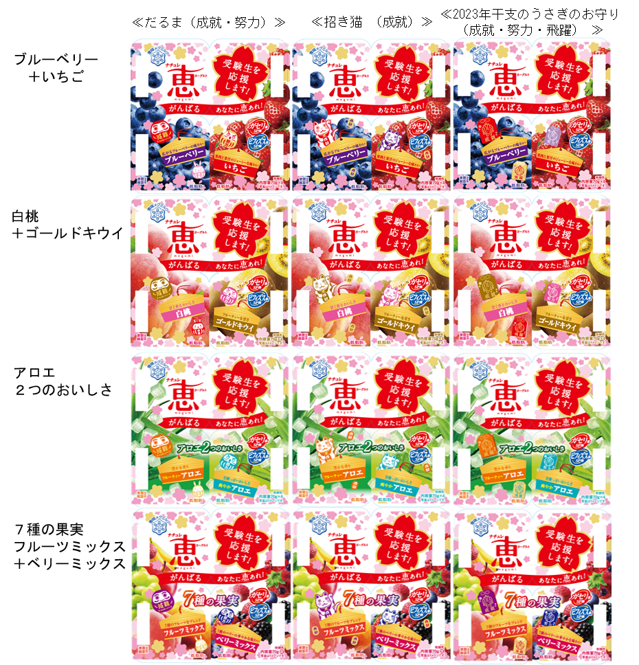 受験生応援パッケージの一例 『ナチュレ 恵 megumi』フルーツヨーグルトシリーズ パッケージデザイン(4フレーバー × 3種類)