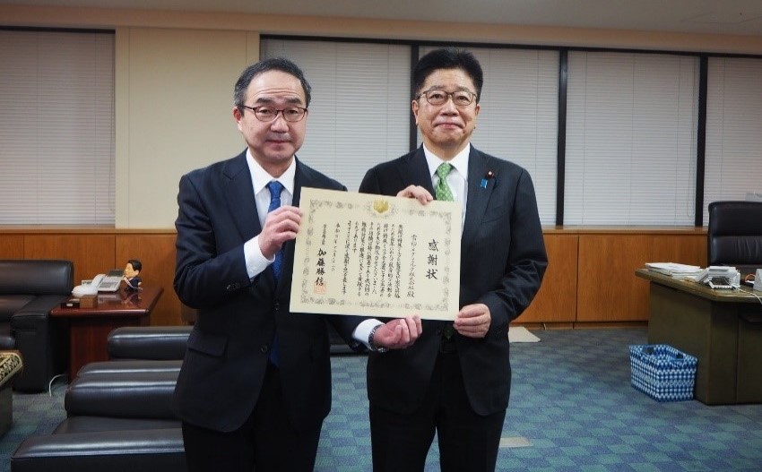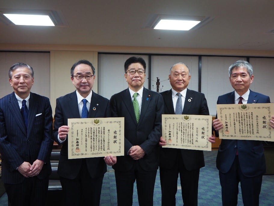 12月22日(木)に厚生労働大臣室にて、同じく功績が認められた株式会社明治、森永乳業株式会社とともに、加藤勝信厚生労働大臣より感謝状が手交されました。