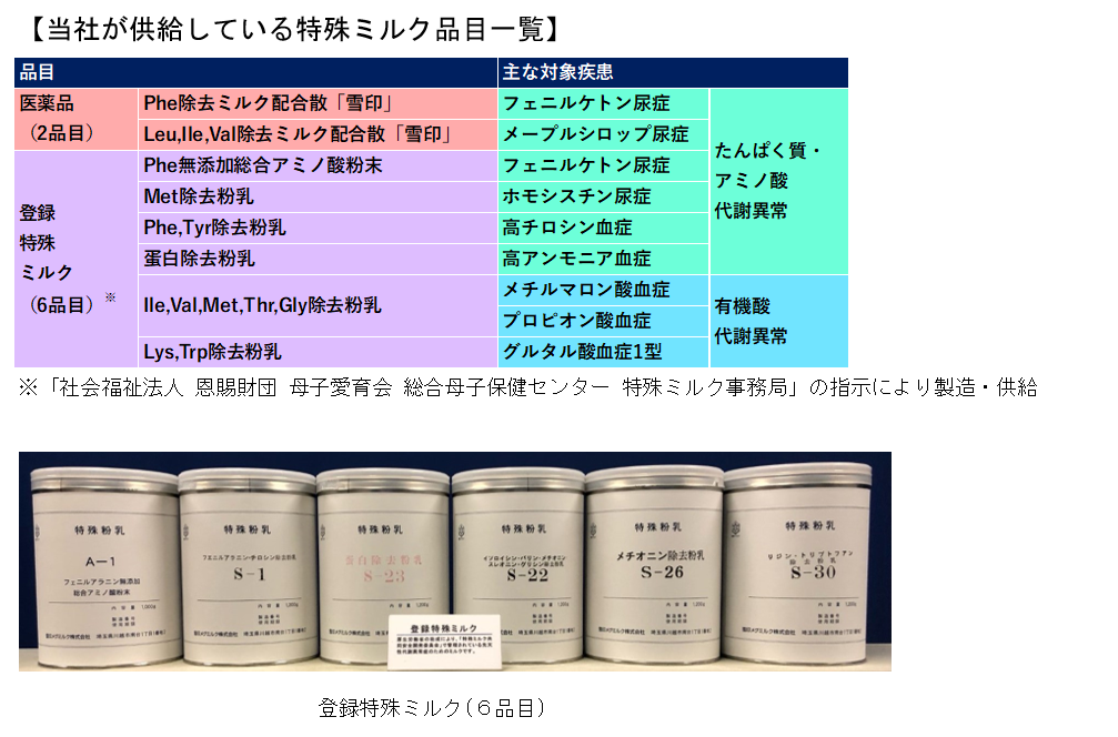 特殊ミルクは、生まれながらにしてアミノ酸などの代謝が十分にできない方のために使用される粉ミルクです。新生児期や乳児期から食事療法を必要とする患者様に、必要不可欠となっています。