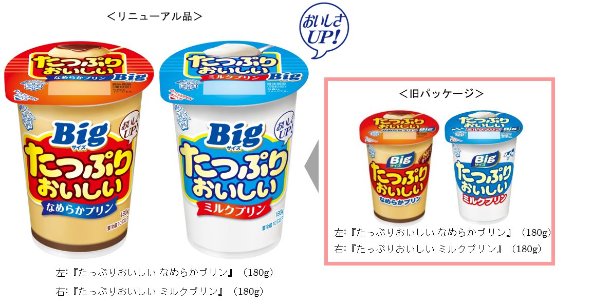 『たっぷりおいしい なめらかプリン』は、やわらかく口どけの良い食感に改良し、カラメルソースは、よりプリンとからまりやすくなるように改良しました。『たっぷりおいしい ミルクプリン』は、練乳の風味を和らげ、後味よく、より軽やかなミルクの風味に改良しました。