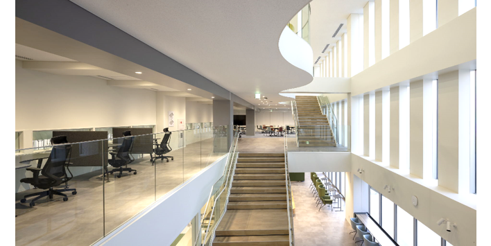 「雪印メグミルク イノベーションセンター」は、ミルクを中心とした食品の新しい価値をカタチにするイノベーション拠点として、「研究者同士が交ざり(交流)」、「専門が溶け合い(相互作用)」、「組織として固まる(一体感)」を実現する研究開発施設を目指しました。