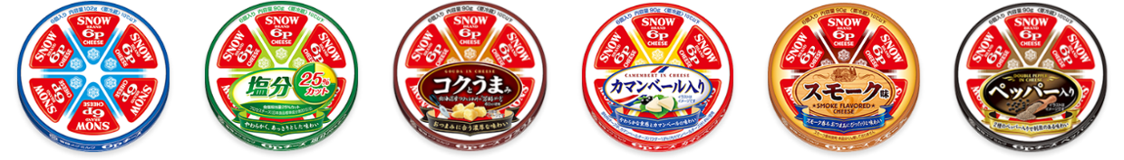 商品ラインナップ (左から)「6Pチーズ」「6Pチーズ 塩分25%カット」「6Pチーズ コクとうまみ」「6Pチーズ カマンベール入り」 「6Pチーズ スモーク味」「6Pチーズ ペッパー入り」