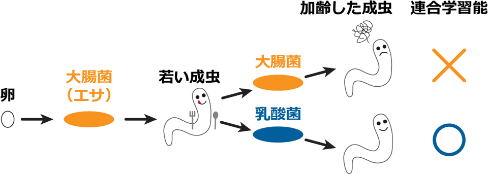 ・餌として用いた大腸菌や乳酸菌が加齢線虫注1)の連合学習能注2)に影響することを見出した。