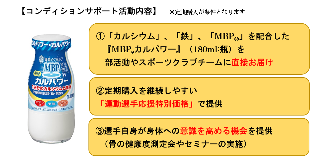 雪印メグミルク株式会社(本社:東京都新宿区、代表取締役社長:佐藤 雅俊)は、宅配専用商品『MBP®カルパワー』(180ml:瓶)で、アスリート(主に高等学校運動部、スポーツクラブチーム)のコンディションサポートを応援いたします。