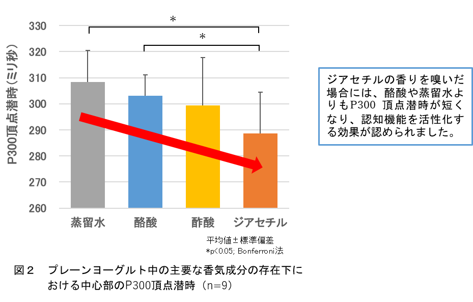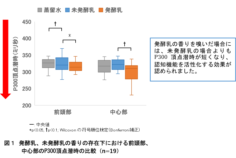 発酵乳の香りが脳機能に与える影響を、認知機能を反映する脳波を測定し、明らかにしました。被験者が発酵乳、未発酵乳、蒸留水の香りを嗅いでいる際の脳波を測定、解析しました。その結果、発酵乳の香りを嗅いでいる際は、蒸留水や未発酵乳の場合と比べ、認知機能を活性化する効果があることが示唆されました。