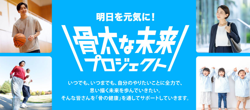 特設サイト「骨太な未来プロジェクト」では、日頃のカルシウム摂取状況が把握できる「カルシウムチェック」、1回5秒で実践できる「かんたん骨体操」、骨の知識が学べる「おとなの骨密ドリル」、骨の健康におすすめのレシピを紹介する「“骨”Good choiceレシピ」など、多様なコンテンツを用意しています。そして様々なメディアを通して骨の重要性や健康な骨づくりに役立つ情報を継続的に発信していきます。