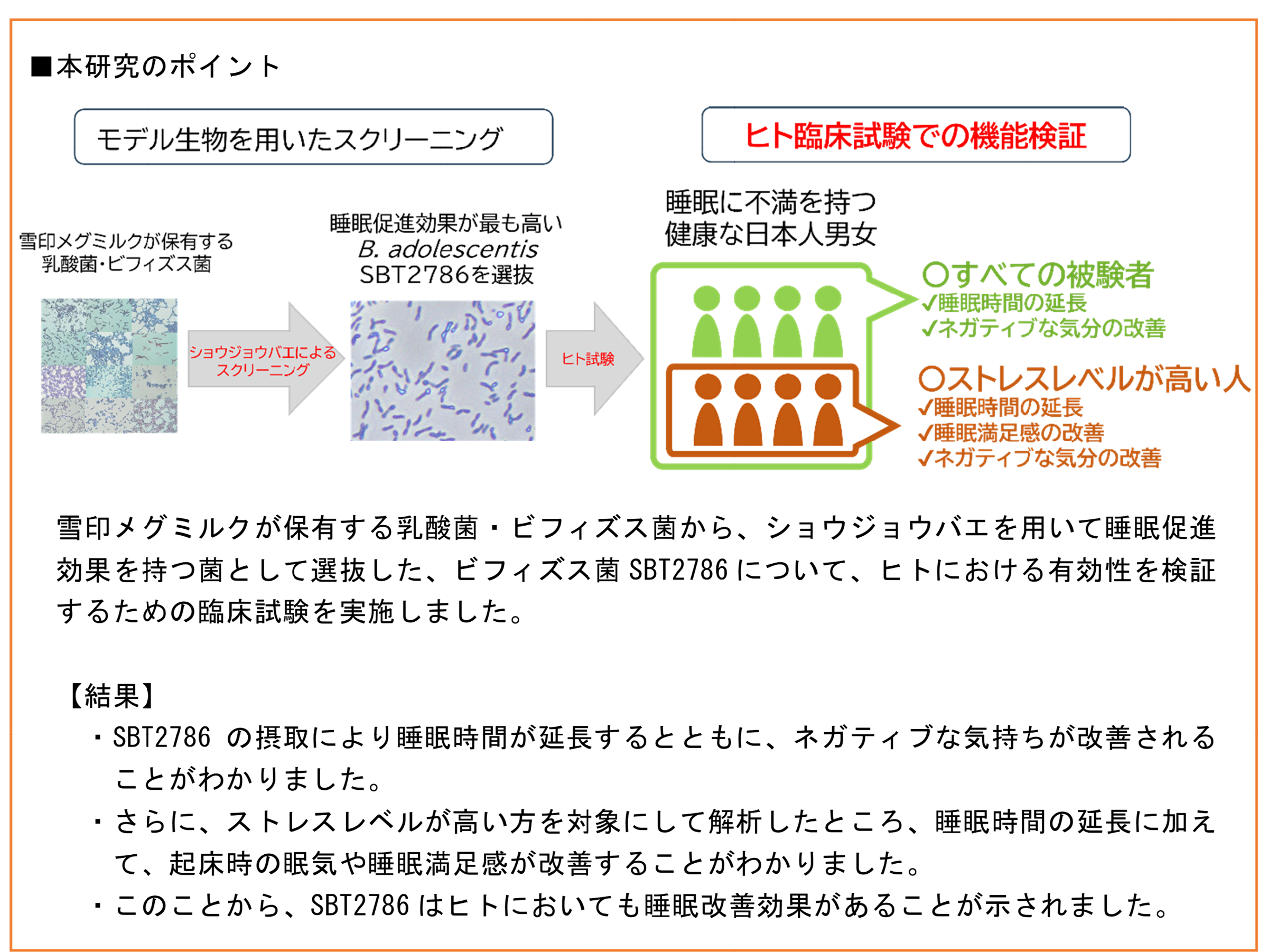 雪印メグミルク株式会社(本社:東京都新宿区 代表取締役社長:佐藤 雅俊)のビフィズス菌Bifidobacterium adolescentis SBT2786(以下、SBT2786)が、日常生活で睡眠に不満を持つ人、特にストレス状態の高い人の睡眠状態を改善するとともに、ネガティブな気持ちを改善することを、ボランティアを対象とした臨床試験で明らかにしました。