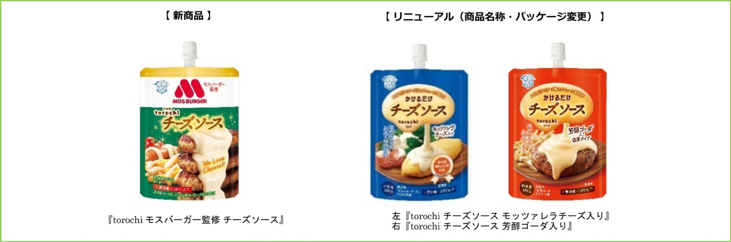 既存の「torochi」シリーズでは、商品名称に「チーズソース」を新たに加え、パッケージに大きく配置することで使い方をイメージしやすくしました。パッケージデザインは色調を変更し、売場での視認性を向上させ、「温めなくてもとろ~り」というコピーを追加し、温めなくても手軽にご利用いただけることを訴求しました。