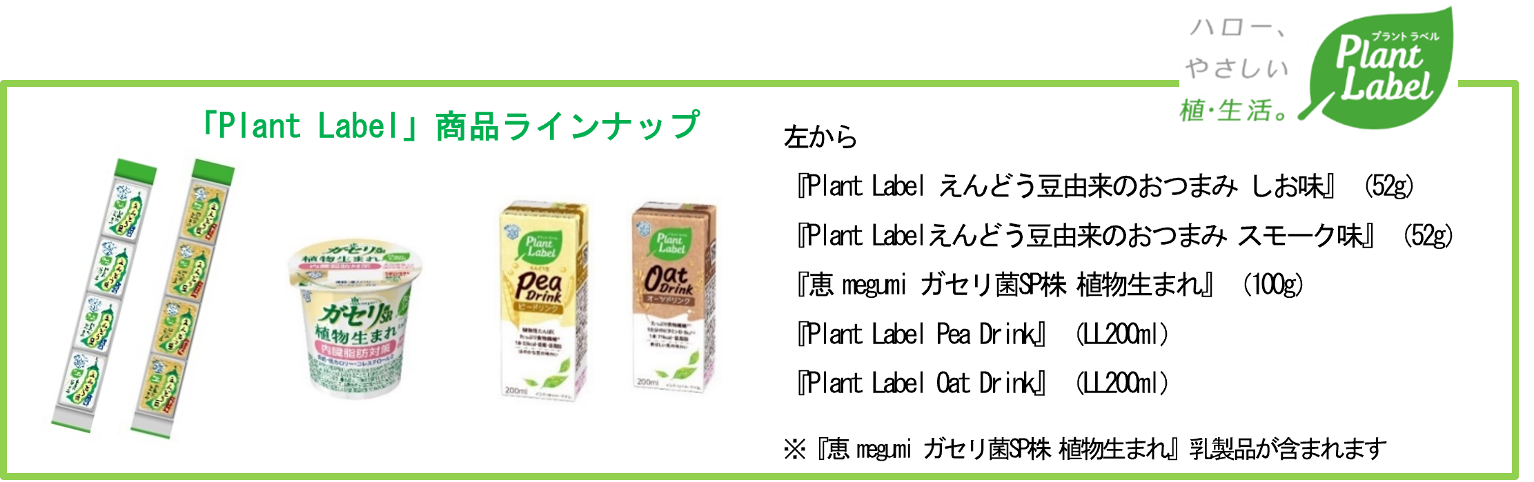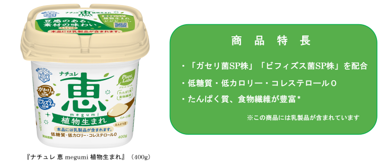 『ナチュレ 恵 megumi 植物生まれ』は、植物性素材の一つとして世界的に注目されている「えんどう豆」由来の原料を使用しており、低糖質・低カロリー・コレステロール0の仕立てで、たんぱく質と食物繊維も豊富※です。『ナチュレ 恵 megumi』シリーズにも使用している当社独自の乳酸菌である「ガセリ菌SP株」と「ビフィズス菌SP株」を配合しています。