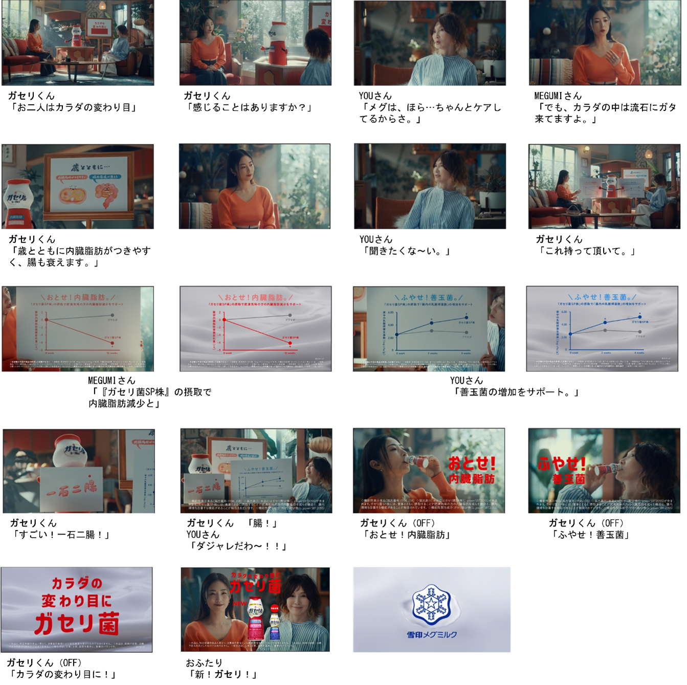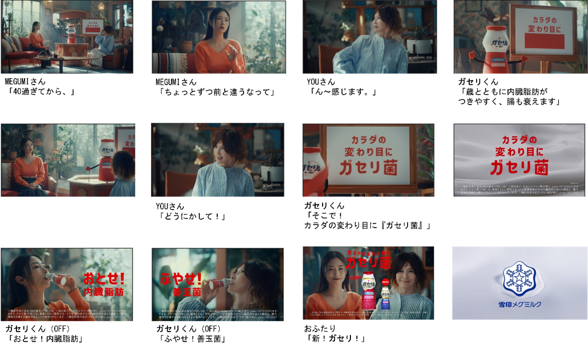 2つの機能を伝えるのは公私ともに仲良しのYOUさんとMEGUMIさんです。カラダの変わり目によるカラダの衰え(内臓脂肪がつきやすく、腸も衰える)を実感する2人に、パペットの「ガセリくん」が「恵 megumi ガセリ菌SP株ヨーグルト」をおすすめします。