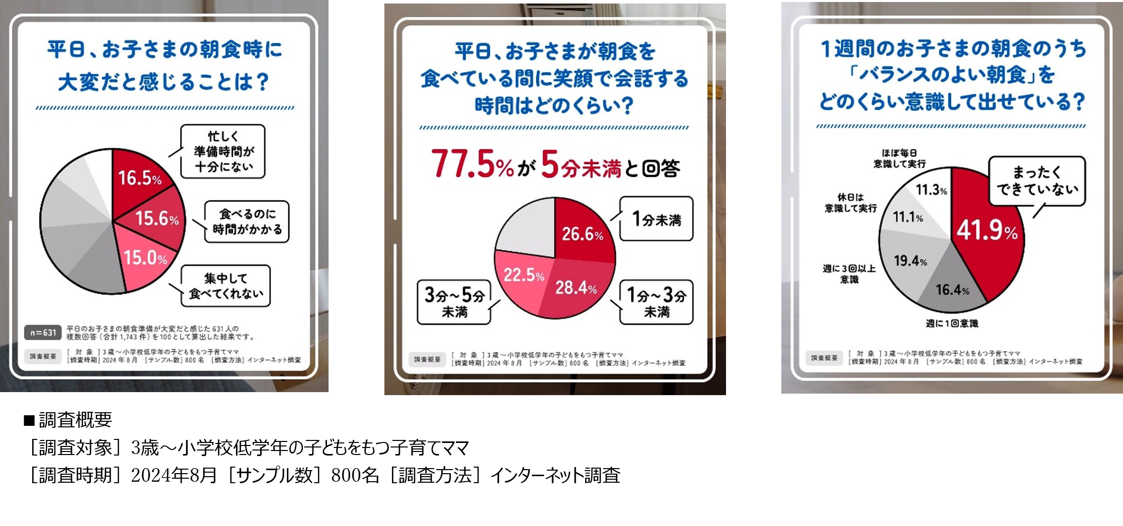 平日に子どもの朝食を用意することが大変だと感じている人は約8割にのぼります。特に、「子どもが食べるのに時間がかかる」「準備する時間がない」「子どもとゆっくり会話する時間がない」「バランスのよい朝食を意識できていない」など、多くの家庭が平日の朝食時にさまざまな悩みを抱えています。