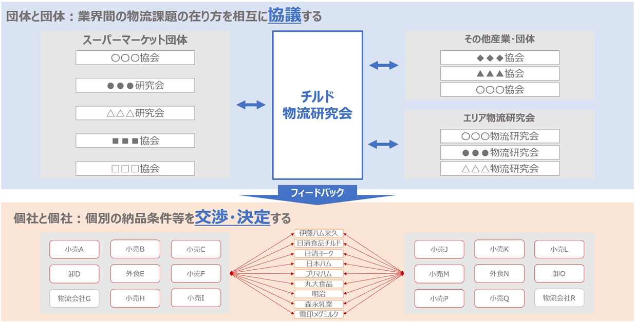 経済産業省 商務・サービスグループ 消費・流通政策課 物流企画室、農林水産省 大臣官房 新事業・食品産業部 食品流通課、国土交通省 物流・自動車局 物流政策課、一般社団法人日本加工食品卸協会、一般社団法人日本乳業協会、日本ハム・ソーセージ工業協同組合、公益社団法人日本ロジスティクスシステム協会