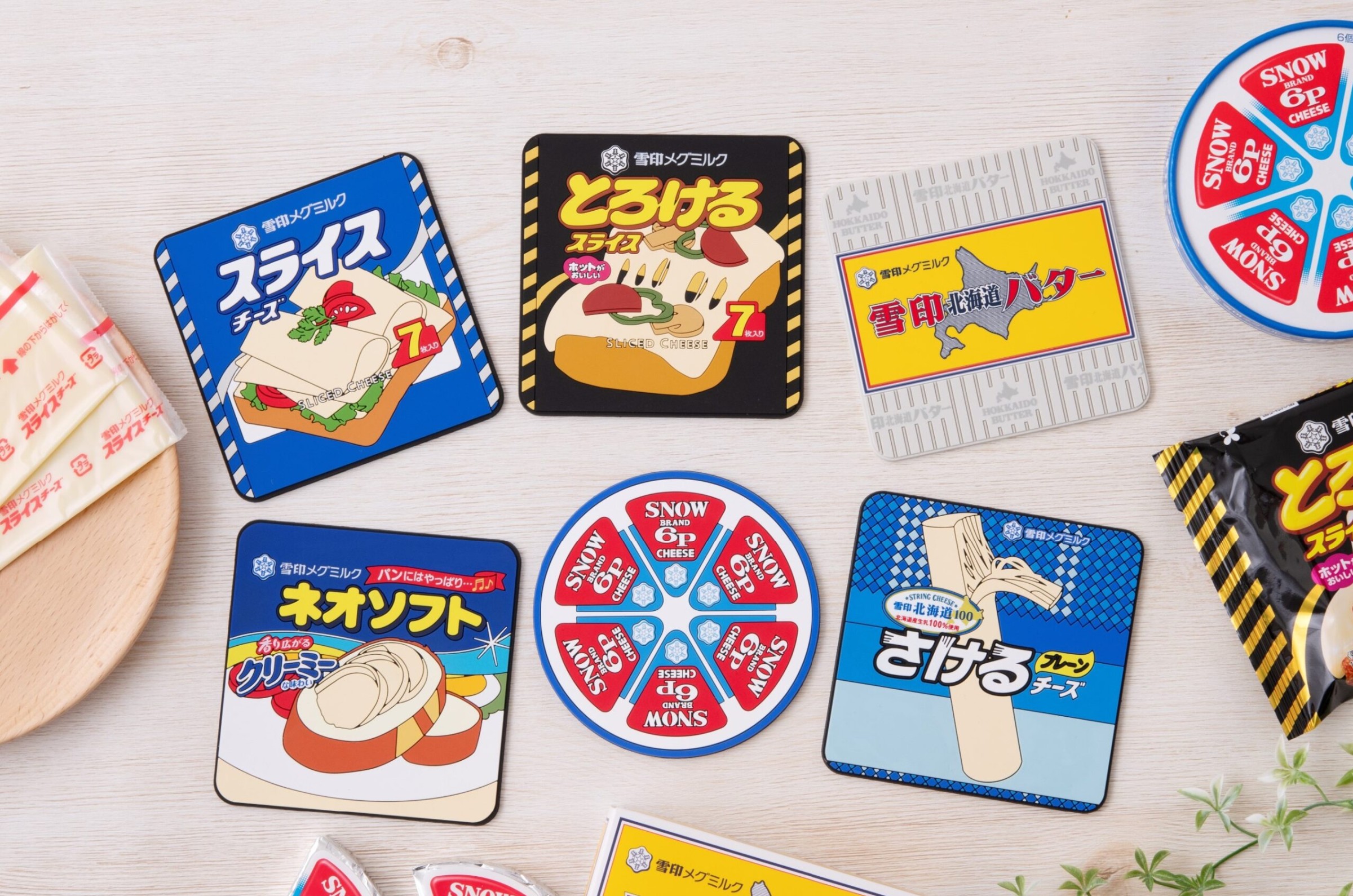 今回、新たに「6Pチーズ」「雪印北海道100 さけるチーズ」などのロングセラー商品のパッケージを再現した、ユニークなラバーコースターを発売します。