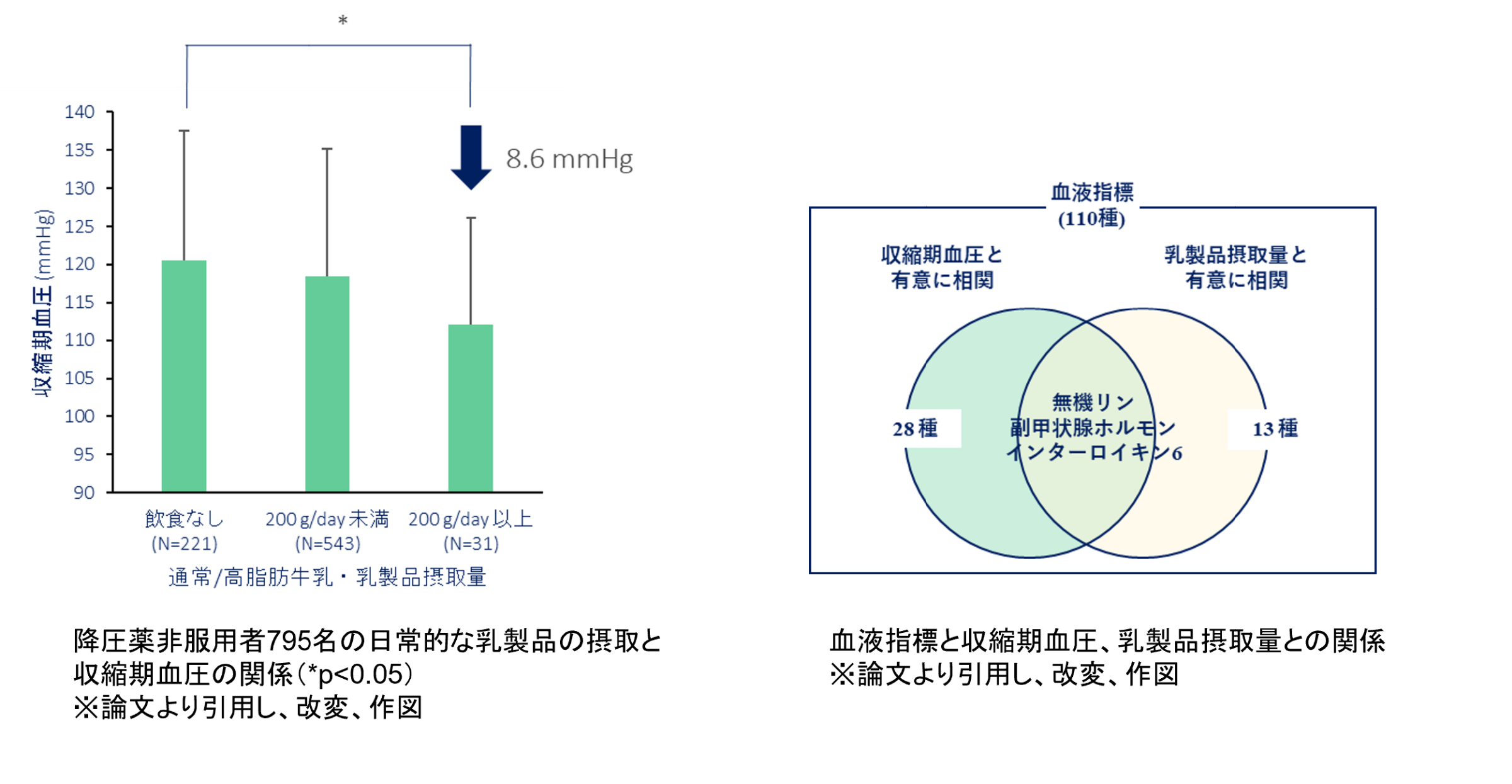 これらの結果より、日本人のような高塩分摂取、低乳製品摂取集団において日常的な牛乳・乳製品摂取は、収縮期血圧の上昇を抑制し、高血圧リスクを低下させることが示された。