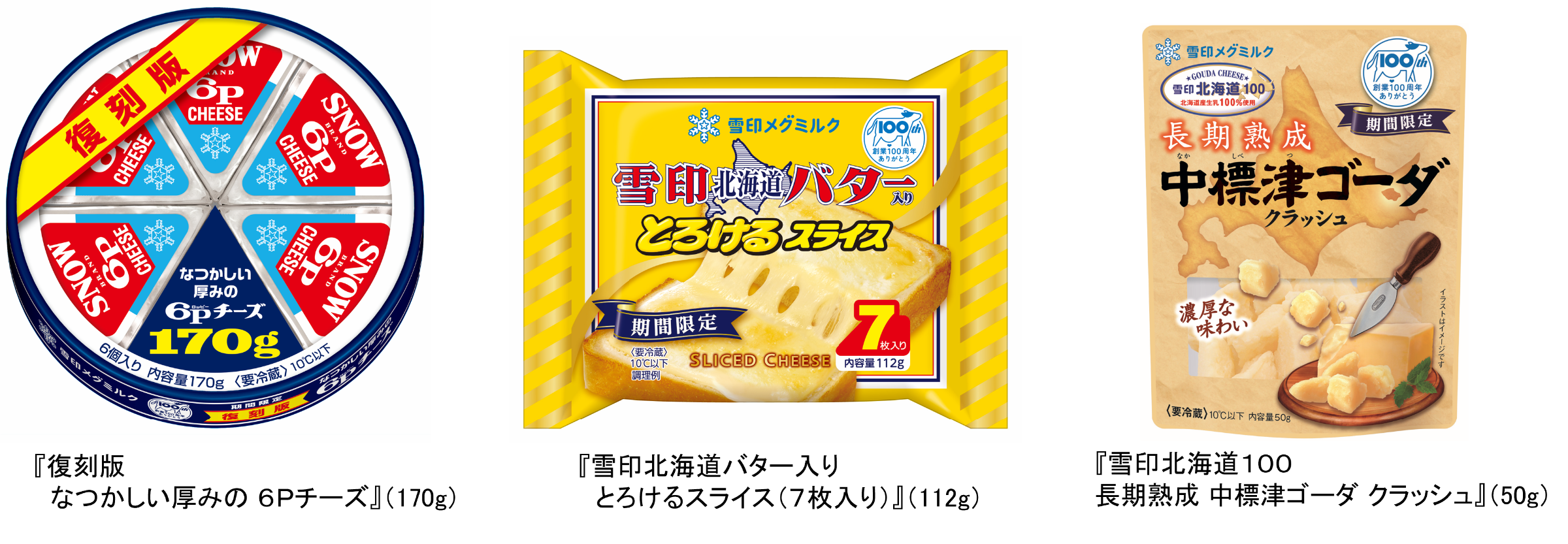 雪印メグミルク株式会社(本社:東京都新宿区、代表取締役社長:佐藤 雅俊)は、『復刻版 なつかしい厚みの 6Pチーズ』(170g)、『雪印北海道バター入り とろけるスライス(7枚入り)』(112g)および『雪印北海道100 長期熟成 中標津ゴーダ クラッシュ』(50g)を期間限定発売いたします。期間は2025年3月1日(土)から2025年8月31日(日)までを予定しています。