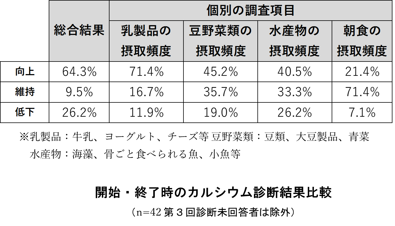 プログラムでは、開始時に参加者に対して骨・カルシウムに関する情報提供を行い、3ヵ月間の期間終了後、当社考案の「カルシウム診断」においてカルシウムの摂取量を診断していただきました。その結果、全体の約64%の参加者の食生活での総合的なカルシウム摂取状況(乳製品、豆野菜類、水産物、朝食の摂取頻度を含む)を表すスコアが向上しました。また、プログラム内で供給した当社乳飲料『MBP®カルパワー』の継続摂取により、約71%の参加者において乳製品の摂取頻度スコアが向上したことがわかりました。さらに、乳製品以外の食品の摂取頻度、朝食の摂取頻度についても向上がみられました。