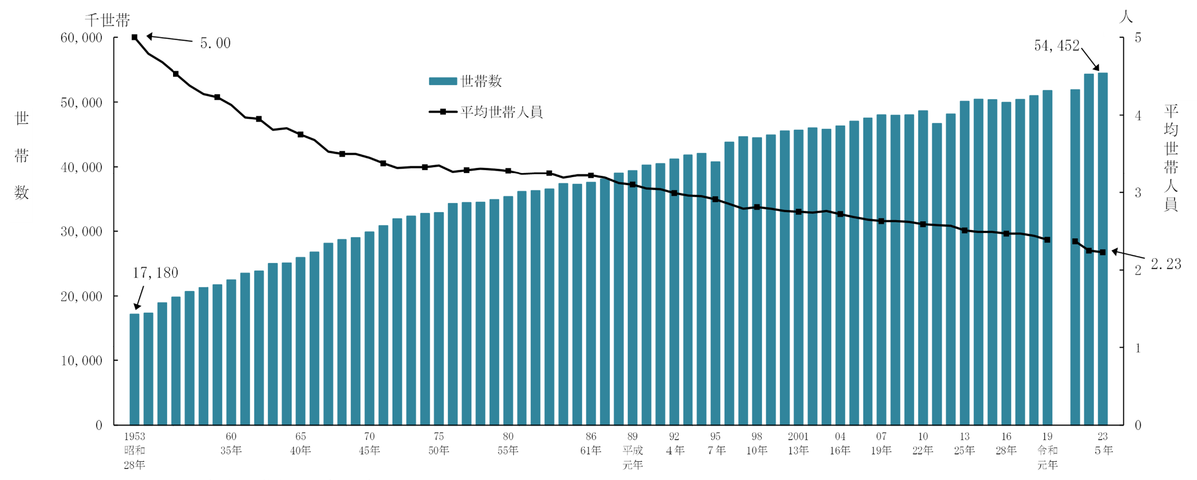 厚生労働省の統計(1953年~2023年)によると、この70年で総世帯数は3倍以上に増加した一方、平均世帯人数は5人から2.23人と半減しており、少人数世帯が増加しています。2023年の世帯構造の調査では「単独世帯」が全世帯の 34.0%と最も多く、「夫婦のみの世帯」を合わせると6割近く(58.6%)にのぼります。