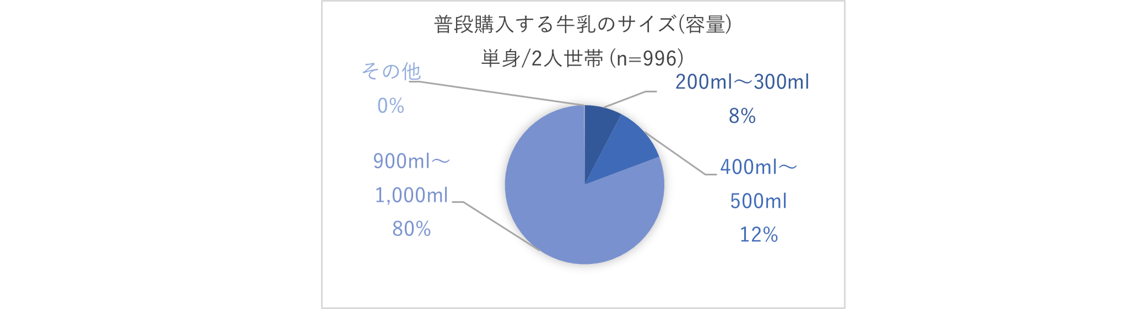 今回当社が行った調査では、世帯人数が単身または2人の少人数世帯における牛乳の購入について、購入頻度は低いが、900~1000mlの大容量サイズを購入して、飲みきれずに廃棄していることが伺えました。飲みきれずに廃棄している人の半数は「500mlと1000mlの中間サイズの牛乳があれば便利だと思う」と回答しています。