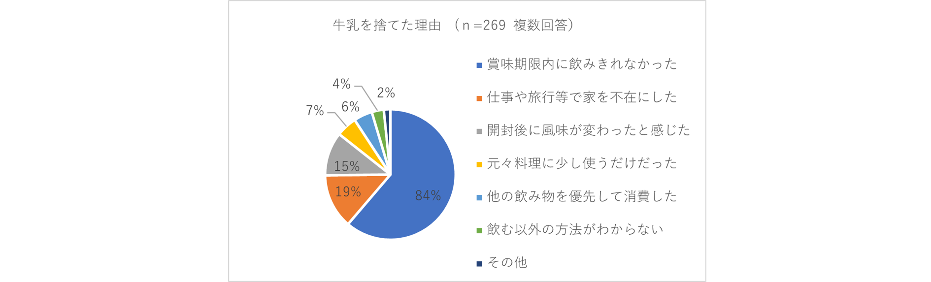 牛乳を捨てたことがある人のうち、その理由は賞味期限切れが最も多く、8割以上にのぼりました。