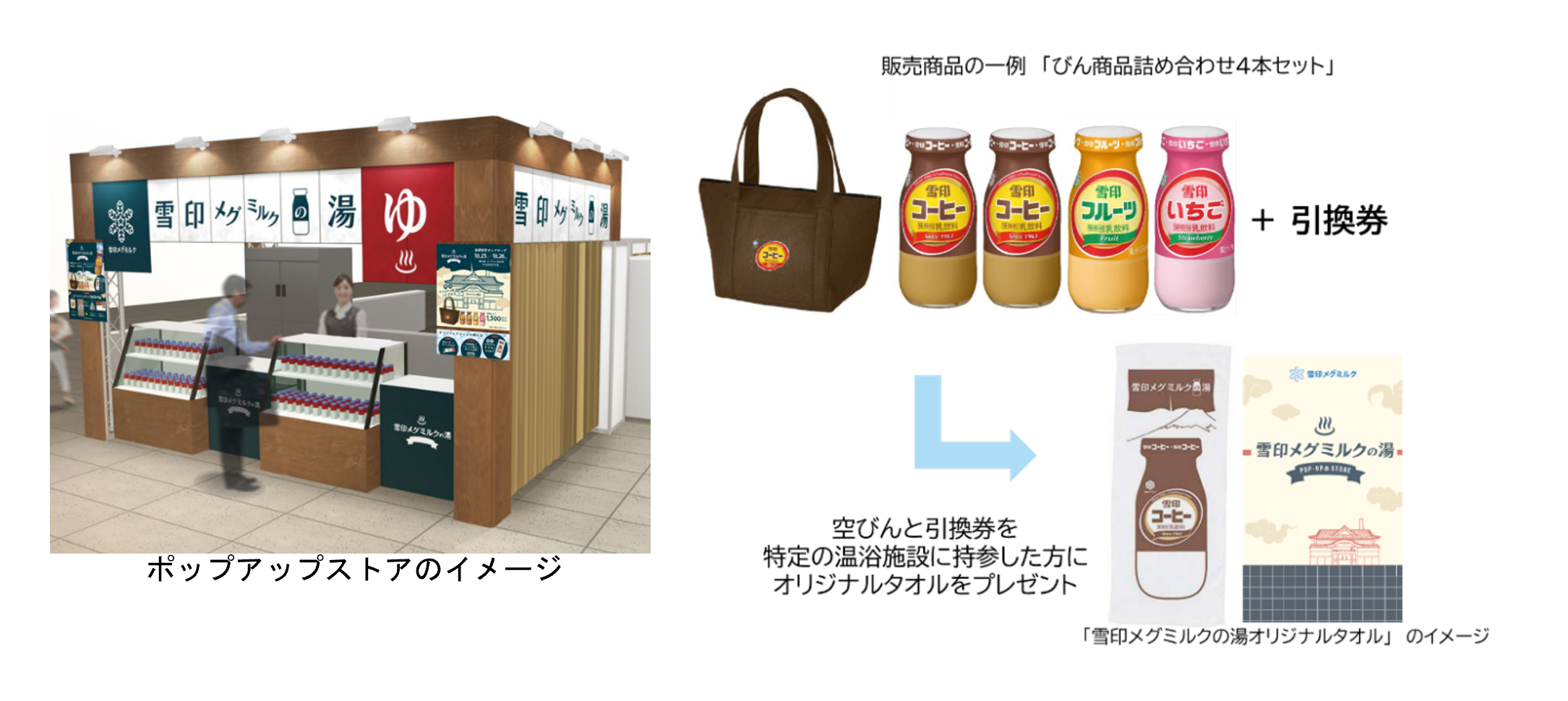 「びん商品詰め合わせ4本セット」をご購入いただいたお客様に、大阪府内の特定の温浴施設で「雪印メグミルクの湯オリジナルタオル」と交換できる引換券を、1点につき1枚プレゼントします。