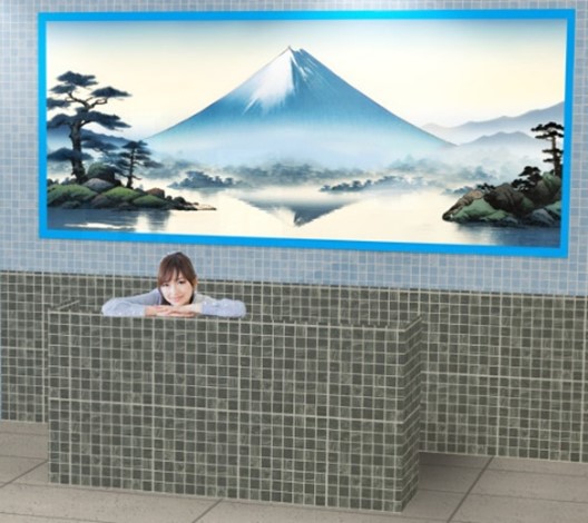 銭湯の脱衣所・洗い場・浴槽をリアルに再現します。浴槽スポットは、富士山のイラストを背景に、手前にタイル壁を設けることで、まるで浴槽に浸かっているかのような写真が撮れる撮影スポットです。